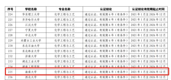本站讯(记者 刘雯箐 通讯员 刘燕霞)日前,中国工程教育专业认证协会正式公布了2020年工程教育专业认证结论,全国共305个专业通过认证,海南大学化学工程与工艺专业名列其中,认证有效期为6年(2021年1月至2026年12月)。截至目前,海南大学已有食品科学与工程、化学工程与工艺两个专业通过中国工程教育专业认证,标志着这两个专业人才培养质量达到国际实质等效水平,进入全球工程教育“第一方阵”。??认证工作是提高专业人才...