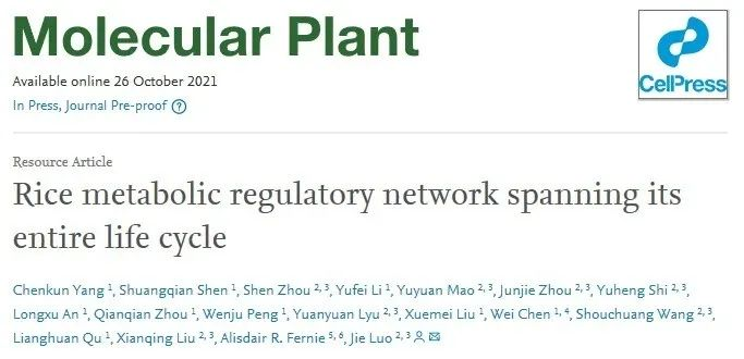 本站讯(记者 李天畅 通讯员 袁其)近日,海南大学热带作物学院罗杰教授团队在《Molecular Plant》在线发表了题为“Rice metabolic regulatory network spanning its entire life cycle”的研究论文。该研究利用代谢组和转录组联合分析,构建了水稻全生育期主要组织器官的代谢调控网络,并精准识别了调节关键代谢产物积累的调控基因。使用籼稻品种珍汕97和明恢63整个生命周期不同组织的样品,结合靶向和非靶向代谢组学分析方法...