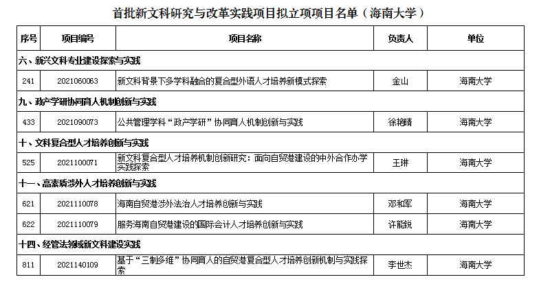 本站讯(记者 李天畅)近日,教育部办公厅发布了《关于公布首批新文科研究与改革实践项目的通知》(教高厅函〔2021〕31号),海南大学获批6项教育部新文科研究与改革实践项目认定。新文科研究与改革实践项目是教育部深入学习贯彻习近平新时代中国特色社会主义思想,贯彻落实全国教育大会精神,落实新文科建设工作会议要求,全面推进新文科建设,构建世界水平、中国特色的文科人才培养体系的具体举措。项目设新文科建设发展理念...