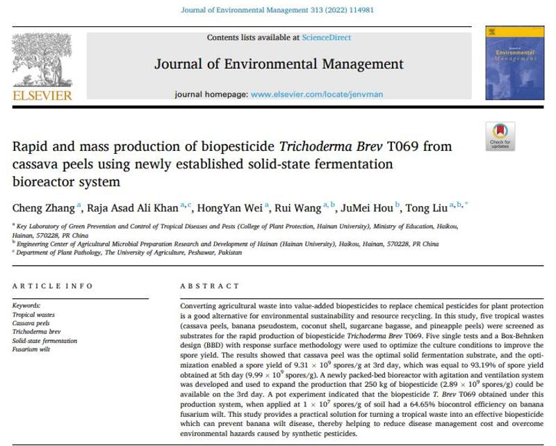 本站讯(记者 李天畅)近日,海南大学植物?;ぱг毫跬淌谕哦永萌却┮捣掀锷久规咦臃郏迪至舜邮笛槭矣呕焦婺;陀τ?。该研究在木霉菌固体发酵方面取得了重要进展。木霉菌(Trichoderma. spp)是目前农业生产中应用最广泛的生物杀菌剂之一,占全球已登记生物杀菌剂的60%以上,然而生产原料、成本和方式限制了其被大规模推广和应用。农业生产过程存在较多可用作固体发酵原料的农业废弃物,这些农业废弃物通...