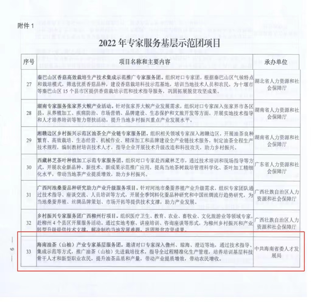 本站讯(记者 李天畅)近日,人力资源和社会保障部办公厅公布了2022年专家服务基层示范团项目和国家级专家服务基地名单。海南大学组织实施的“海南油茶(山柚)产业专家基层服务团”成功入列2022年专家服务基层示范团项目。该项目由海南大学农业农村学院组织实施,按照儋州市与海南大学签订的乡村振兴战略合作协议开展服务活动。项目拥有科技专家35人,将以儋州为重点,深入琼海、澄迈等地,通过技术指导、集成示范等方式,推广油茶(...